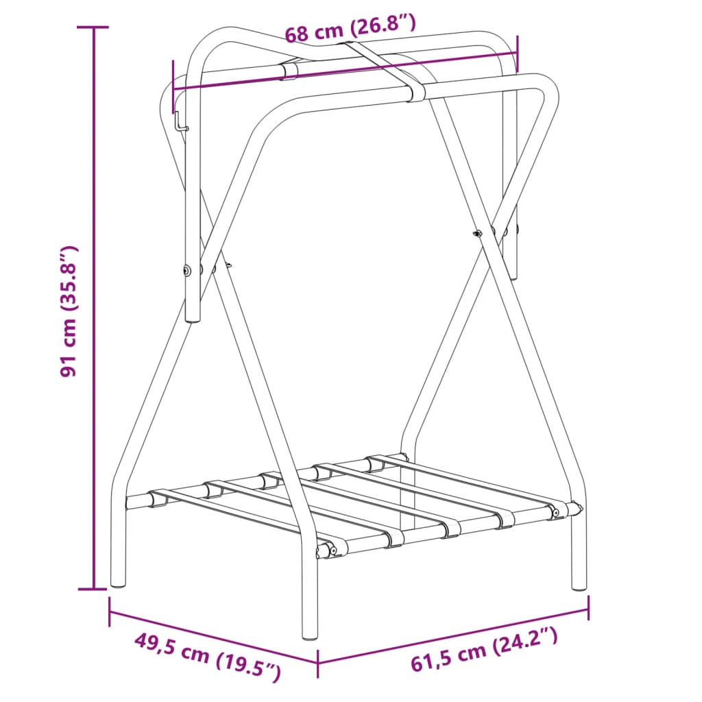 - Afmetingen: Het zadelrek heeft een lengte van 68 cm, een breedte van 49,5 cm en een hoogte van 91 cm.